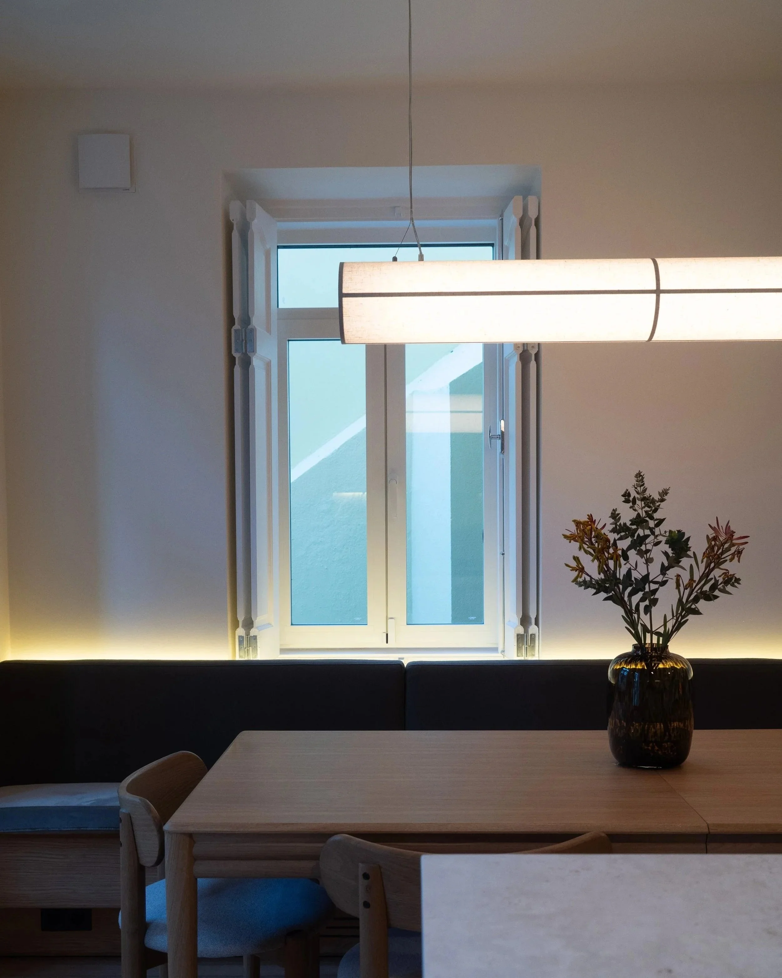 Inside, the challenge was clear: a ground-floor apartment with limited natural light. The answer was lighting design; warm tones layered throughout every room, reflective surfaces that expand the space, and a considered approach that makes the apartment feel harmonious and bright without ever feeling artificial.