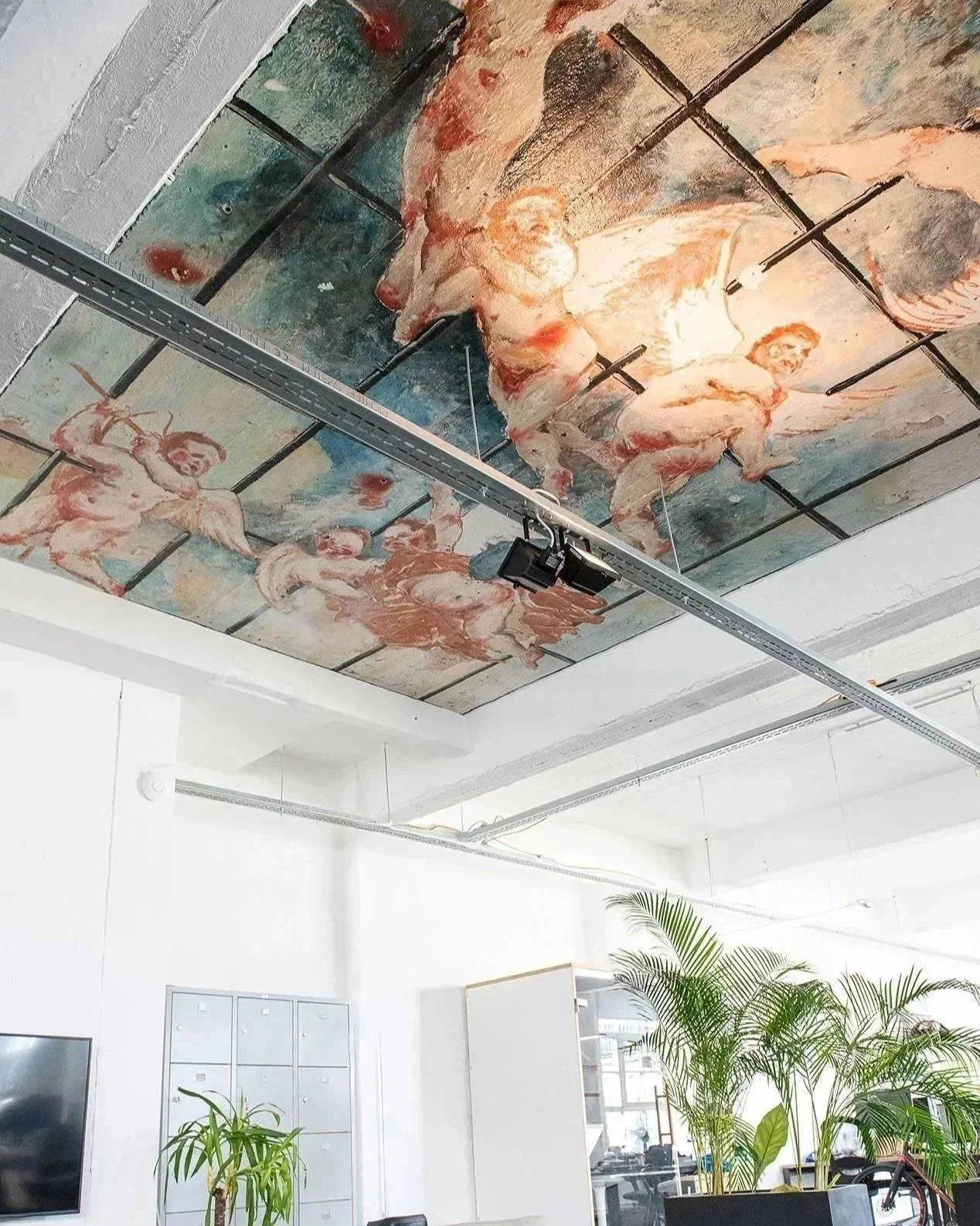 A baroque mural, angels, colour, just a bit of drama suspended above raw concrete floors and industrial structure. That contrast became the space's identity.